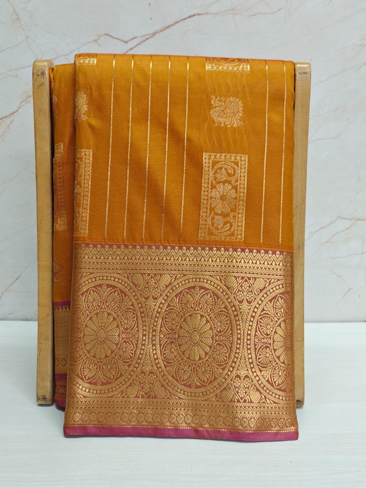 The Mandala Jari Border with Oosi Ilai Series Kanchi Semi Silk Sarees exemplifies a blend of traditional charm and contemporary elegance. These sarees feature an intricate circular Mandala Jari Border paired with delicate Oosi Ilai (lines) motifs on Kanchi Semi Silk fabric. The fine silk threads provide a luxurious texture and graceful drape, ensuring both visual appeal and comfort. The thoughtfully chosen color palette enhances the richness of the silk, making it a perfect choice for special occasions and cultural celebrations. This saree is a testament to Kanchipuram weavers’ artistry, showcasing timeless beauty and craftsmanship.