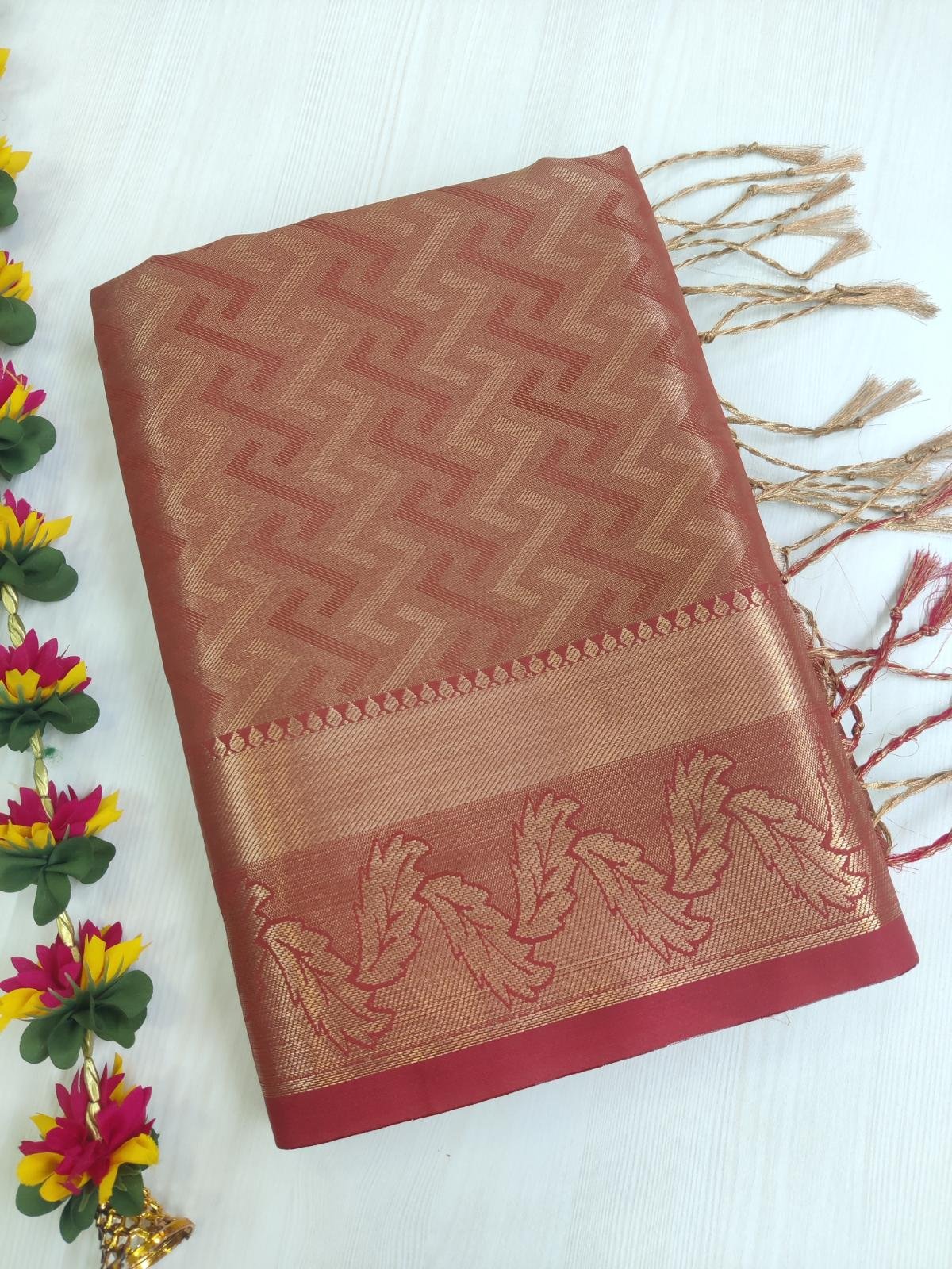 Elevate your style with our Premium Tissue Silk Saree exclusively designed by Nira.This type of saree made from a delicate blend of silk threads and metallic threads (often zari), giving it a sheer, shimmering, and elegant look. It is known for its lightweight feel, soft texture, and glossy finish, making it a popular choice for festive occasions and weddings.