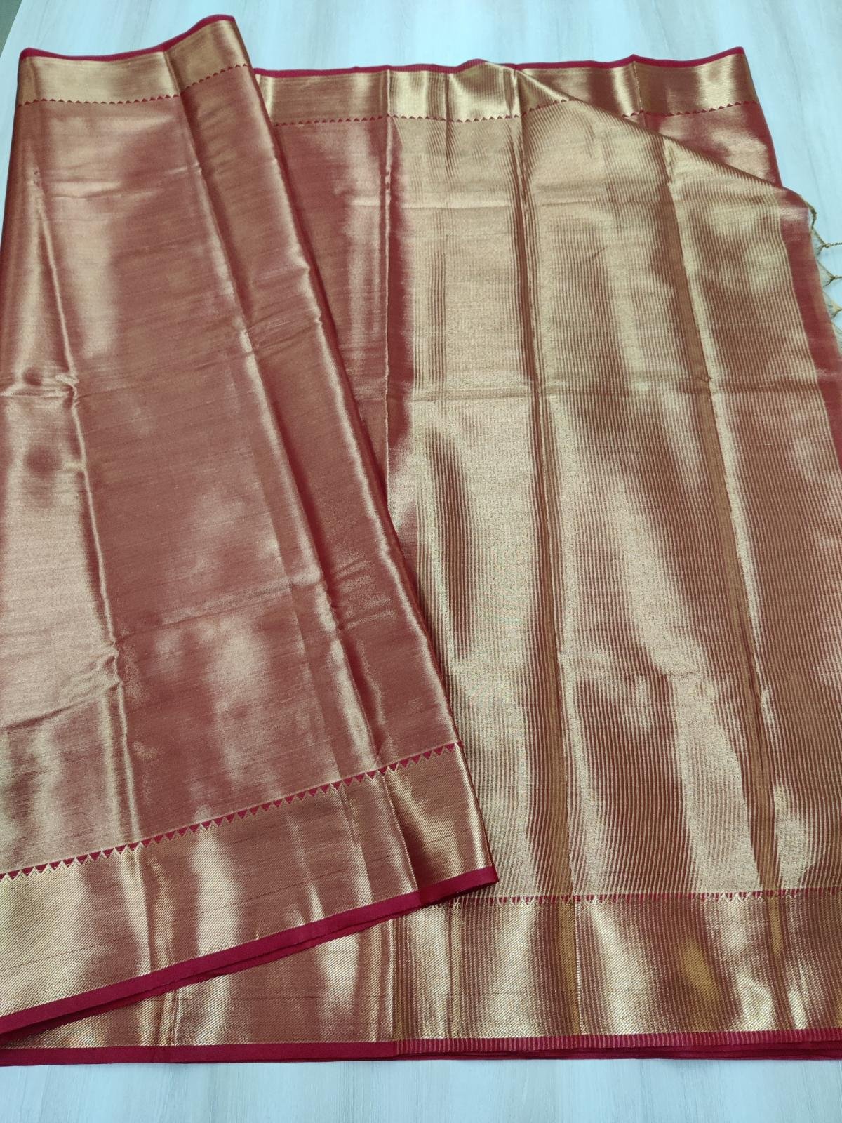 Elevate your style with our Premium Tissue Silk Saree exclusively designed by Nira.This type of saree made from a delicate blend of silk threads and metallic threads (often zari), giving it a sheer, shimmering, and elegant look. It is known for its lightweight feel, soft texture, and glossy finish, making it a popular choice for festive occasions and weddings.